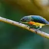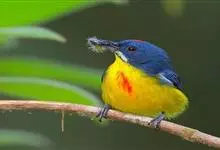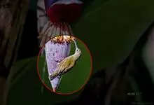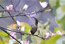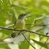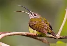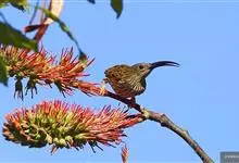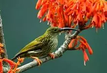 红胸啄花鸟:体重5-10克,体长60-92毫米。体形纤小。雄鸟上体呈辉亮的金属绿色;下体棕黄,胸部具一朱红色块斑,极易与其他啄花鸟区别。雌鸟上体呈橄榄绿,下体棕黄色。虹膜褐色,嘴褐黑色或角灰色,…全部>>