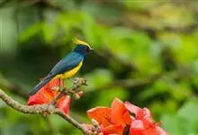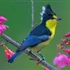 冕雀:共有4个亚种。体长20-21厘米,体重34-49克。具蓬松的黄色长型冠羽。雌鸟似雄鸟,但喉及胸深橄榄黄色,上体沾橄榄色。不会被误认的体大的黄色及黑色山雀。混群栖于原始林及次生林的林冠层,…全部>>