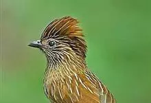 条纹噪鹛是画眉科、噪鹛属中型鸟类,体长28-32厘米。头具短的羽冠,上体栗褐色,飞羽外翻蓝灰色。下体棕栗色,腹以后转为褐白色。除飞羽和尾羽外,所有上、下体羽均具白色羽干纹。极为醒目。野外特征明显,…全部>>