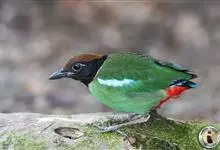 绿胸八色鸫:是雀形目八色鸫科的鸟类,共有12个亚种。体长为16-18厘米,体重65-69克。体型圆胖,尾短,腿长。头黑,上体绿色,两翼深色而具白色斑纹,头顶至后枕深褐,胸及腹部苹果绿,臀亮红。…全部>>