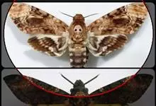 鬼脸天蛾,是鳞翅目天蛾科面形天蛾属动物。成虫翅展100~125毫米,体黑褐色;胸背有骷髅形斑纹;卵圆球形,直径约2毫米,淡黄绿色,表面光滑;老熟幼虫体长70~90毫米,蛹体长约56毫米;前翅为褐色,…全部>>