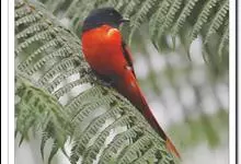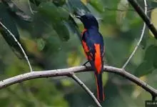 灰喉山椒鸟:共有8个亚种。体长18-22厘米。雄鸟头部和背亮黑色,腰、尾上覆羽和下体朱红色,翅黑色具一大一小的两道朱红色翼斑。中央尾羽黑色,外侧尾羽基部黑色,端部红色。…全部>>