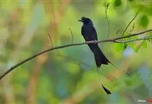 发冠卷尾是中型鸟类,体长28-35厘米。通体绒黑色缀蓝绿色金属光泽,额部具发丝状羽冠,外侧尾羽末端向上卷曲。栖息于海拔1500米以下的低山丘陵和山脚沟谷地带,多在常绿阔叶林、次生林或人工松林中活动。…全部>>