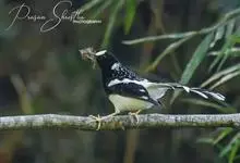 斑背燕尾是鹟科、燕尾属中型鸟类,体长24-25厘米。额至头顶前部白色,其余头、颏、喉、胸黑色,后颈有一白领,背黑色具圆形白色斑点,腰白色,两翅黑色具白色翅斑,尾呈深叉状,黑色、具白色端斑。…全部>>