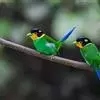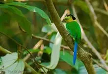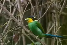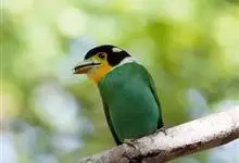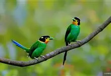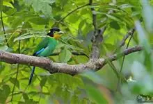 长尾阔嘴鸟是雀形目阔嘴鸟科的鸟类,体长约25厘米,是绿色阔嘴鸟。形长的楔形尾蓝色,喉及脸黄色,顶冠及颈背黑色。两翼黑并具显著的蓝色斑块。头顶具蓝色小点斑,眼后有一黄色点斑。亚成鸟多为绿色。结群活动于…全部>>