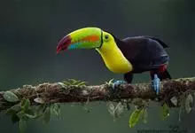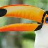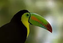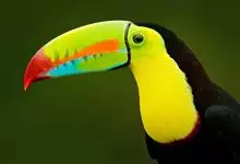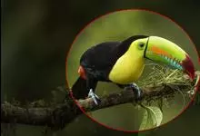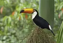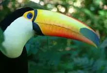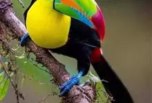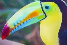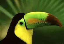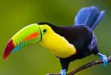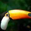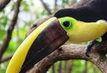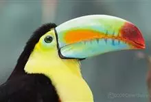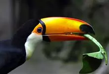 鵎鵼:又名巨嘴鸟。体长约67厘米,嘴巨大,长17~24厘米,宽5~9厘米,形似嘴刀。嘴非常漂亮,上半部黄色,略呈淡绿色,下半部呈蔚蓝色,喙尖点缀着一点殷红。眼睛四周镶嵌着天蓝色羽毛眼圈,胸脯橙黄色,…全部>>