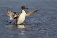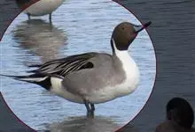 针尾鸭,是雁形目鸭科鸭属动物。体长约75厘米的大型戏水鸭,雄鸟头暗褐色,颈侧有白色纹路,向下与胸部白色相连,中央一对尾羽特别长;背灰色,有黑色细纹;翼镜绿色,胸腹白色,尾下覆羽黑色;雌鸟体羽大致为褐色,…全部>>