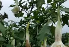 洋金花是茄科曼陀罗属植物,一年生草本植物,全株近于无毛。茎直立,圆柱形,高30~100cm,基部木质化,上部呈义状分枝。叶互生,上部的叶近于对生;叶柄长2~6cm,表面被疏短毛;叶片卵形、长卵形或心形,…全部>>