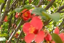 贴梗海棠Nakai)是蔷薇科、木瓜海棠属植物。落叶灌木,高达2米,枝条直立开展,有刺。叶片卵形至椭圆形,稀长椭圆形,长3-9厘米,宽1.5-5厘米。花先叶开放,3-5朵簇生于二年生老枝上。…全部>>