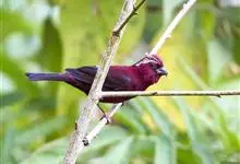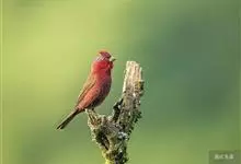酒红朱雀小型鸟类,体长13~15厘米。雄鸟通体深红色,头部深朱红或棕红色,下背和腰玫瑰红色,眉纹粉红色而具丝绢光泽。两翅和尾黑褐或灰褐色、具暗红色狭缘,内侧两枚三级飞羽具淡粉红色先端。…全部>>