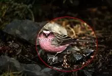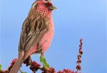 喜马拉雅白眉朱雀:小型鸟类,体长15-17厘米,体重24-35克。额基、眼先深红色,前额和一条长而宽阔的眉纹珠白色沾有粉红色并具丝娟光泽,在暗色的头部极为醒目。头顶至背棕褐或红褐色、具黑褐色羽干纹,…全部>>