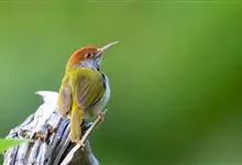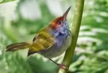 普通缝叶莺,是雀形目鹅科莺亚科缝叶莺属一种。体长10-14厘米,体重7-10克,雄鸟前额棕红,头顶至枕棕橄榄褐,上体橄榄绿染黄,飞羽及尾羽暗褐;繁殖期雄鸟的中央尾羽特形延长,下体淡皮黄白色。…全部>>