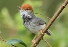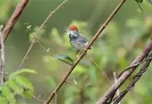 黑喉缝叶莺:体长11.5厘米,是一种小型的顶冠棕色、腹部白色的莺。尾甚长而常上翘,臀黄色,具特征性的偏黑色喉,上体橄榄绿色,头侧灰色。雌鸟色暗,头少红色且喉少黑色。与长尾缝叶莺的区别在后顶冠亦为棕色,…全部>>