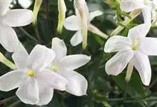 素馨花,木犀科素馨属多年生的攀援灌木植物。攀援灌木,小枝圆柱形,具棱或沟;叶对生,叶轴常具窄翼,小叶片卵形或长卵形;聚伞花序顶生或腋生,花序梗长,苞片线形,花萼无毛,裂片锥状线形,花冠白色,…全部>>
