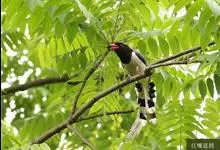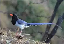 红嘴蓝鹊,别名山鹊、长尾鹊,是鸦科蓝鹊属的一种观赏性较强的大型鸣禽。该物种为体长54~65cm,头、颈、喉和胸黑色,头顶至后颈有一块白色至淡蓝白色或紫灰色块斑,其余上体紫蓝灰色或淡蓝灰褐色。尾长呈凸状,…全部>>