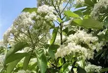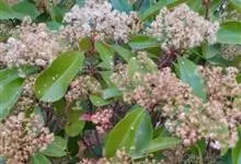 石楠 Kalkman),是蔷薇科石楠属的常绿乔木,高5~12米,株型紧凑,树冠圆球形。树枝为褐灰色;鳞片为褐色,没有毛;叶片革质,长椭圆至侧卵状椭圆形,有锯齿,新叶红色光亮。复伞房花序,白色小花,…全部>>