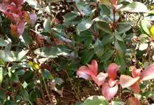 红叶石楠 是蔷薇科,石楠属杂交种,为常绿小乔木或灌木,乔木高可达5米、灌木高可达2米。叶片革质,长圆形至倒卵状、披针形,叶端渐尖,叶基楔形,叶缘有带腺的锯齿,花多而密,复伞房花序,花白色,梨果黄红色,…全部>>
