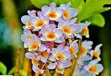 玫瑰石斛是兰科石斛属的多年生附生草本植物。茎斜下或下垂,青绿色,圆柱形,节间鞘具绿或白色相间的条纹;叶窄披针形;花序短,生于已落叶的老茎上部,花序梗长,萼片和花瓣白色,上部带淡紫色,干后蜡质状,…全部>>