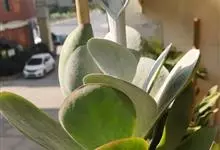 唐印为景天科伽蓝菜属的多年生肉质草本植物。植株中型,株高50厘米,宽20厘米,多分枝;叶片肉质,对生,卵形,全缘,先端钝圆,叶片淡绿色至灰绿色,表面被有厚厚的白粉,光照充足时,叶缘呈红色;圆锥花序,…全部>>
