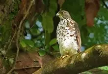 凤头鹰是隼形目鹰科鹰属鸟类。体大,具短羽冠。成年雄鸟上体灰褐;两翼及尾具横斑;下体棕色;胸部具白色纵纹;腹部及大腿白色具近黑色粗横斑;颈白,有近黑色纵纹至喉,具两道黑色髭纹。亚成鸟及雌鸟似成年雄鸟,…全部>>