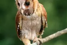 栗鸮:是鸟纲、草鸮科的猫头鹰。体长约29厘米,体重311-360克。是一种中等体型的红褐色鸮。其心形脸庞及时而竖起的“耳朵”与仓鸮甚似。上体红褐而具黑白点斑,下体皮黄偏粉具黑点,脸近粉色。虹膜深褐色,…全部>>