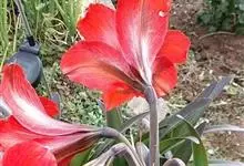 朱顶红 H. E. Moore),石蒜科属多年生草本植物,鳞茎近球形,并有匍匐枝;叶鲜绿色,带形;花茎中空,稍扁,具有白粉,圆筒状,花被裂片长圆形,顶端尖,红色,略带紫色;花丝红色,…全部>>