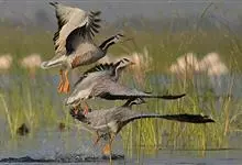灰雁:体长70-90厘米,翼展147-182厘米,体重2.5-4千克,寿命17年。体大而肥胖。嘴、脚肉色,上体灰褐色,下体污白色,飞行时双翼拍打用力,振翅频率高。脖子较长。腿位于身体的中心支点,…全部>>