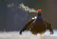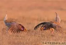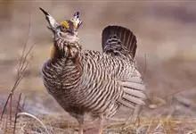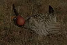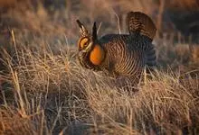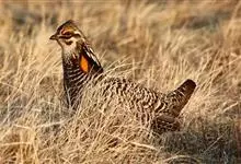草原松鸡:体长43-47厘米,翼展69厘米,体重900-1100克。雄鸟头顶耸立的针状羽毛形成的两个尖顶羽冠。颈部和眼睛上方有黄橙色的膨胀的大气囊。雌鸟的上体是锈褐色,夹杂着黑色及皮黄色的的横斑,…全部>>