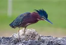 绿鹭:是鹳形目鹭科绿鹭属鸟类。体型小,头顶黑,枕冠亦黑色,上体蝉灰绿色,下体两侧银灰色;前额至后枕及冠羽墨绿色,眼后有一白斑,颊纹黑色;颚纹白色,后颈、颈侧和体侧烟灰色;背部披灰绿色矛状长羽,…全部>>