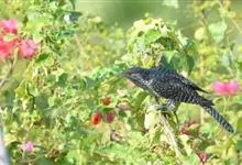 斑翅凤头鹃: 成鸟具羽冠,上体及头侧、翅、尾等黑色,具铁绿色亮辉,尾羽端部具白斑,两侧者形宽,中央者较狭;下体白色、淡灰白或略带棕黄色。虹膜褐至红褐色;嘴黑色;脚灰蓝黑色。…全部>>