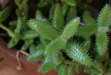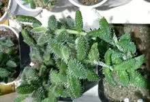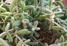 刺叶露子花 Schwantes)是番杏科、露子花属植物。肉质灌木。植株高30厘米左右。分枝密集,二歧分枝,小枝粗0.2-0.4厘米,灰褐或浅褐色,幼枝上有白色小突起。叶肉质,色翠绿,卵圆状半球形,…全部>>