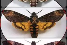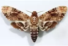 鬼脸天蛾,是鳞翅目天蛾科面形天蛾属动物。成虫翅展100~125毫米,体黑褐色;胸背有骷髅形斑纹;卵圆球形,直径约2毫米,淡黄绿色,表面光滑;老熟幼虫体长70~90毫米,蛹体长约56毫米;前翅为褐色,…全部>>
