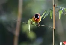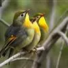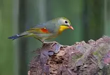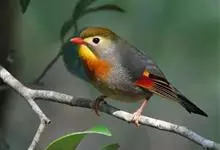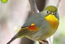 银耳相思鸟小型鸟类,体长14~18厘米。头顶黑色,耳羽银灰色,前额橙黄色;外侧飞羽橙黄色,基部朱红色,极为鲜艳、醒目。尾圆形,尾上、尾下覆羽朱红色,尾暗灰褐色,外侧尾羽橙黄色,其余上体橄榄绿或橄榄黄色。…全部>>
