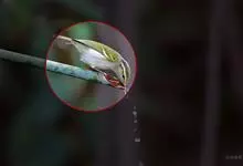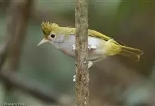 白腹凤鹛是绿鹃科、绿凤鹛属的小型鸟类,体长10-12厘米。上体从头到尾黄绿色,有短的羽冠,头顶微具黑色羽轴纹;眼先、眼周,耳羽和下体灰白色,尾下覆羽黄色。虹膜褐色或红褐色,上嘴浅褐色或肉褐色,…全部>>