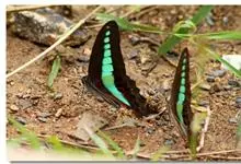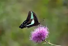青带凤蝶Graphium sarpedon ,又名青凤蝶,是最普遍的中型凤蝶,飞行速度很快。青带凤蝶的翅膀中央有许多浅蓝色的斑点,很整齐地排列成一条直线。这些斑点由上而下逐渐变大,就像一条青色的带子。全部>>