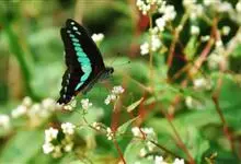 青带凤蝶Graphium sarpedon ,又名青凤蝶,是最普遍的中型凤蝶,飞行速度很快。青带凤蝶的翅膀中央有许多浅蓝色的斑点,很整齐地排列成一条直线。这些斑点由上而下逐渐变大,就像一条青色的带子。全部>>