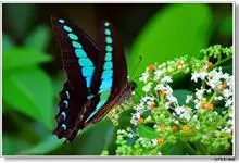 青带凤蝶Graphium sarpedon ,又名青凤蝶,是最普遍的中型凤蝶,飞行速度很快。青带凤蝶的翅膀中央有许多浅蓝色的斑点,很整齐地排列成一条直线。这些斑点由上而下逐渐变大,就像一条青色的带子。全部>>