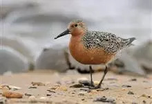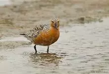 红腹滨鹬,是鹬科、滨鹬属的小型涉禽,体长23-25厘米,嘴较短而直、黑色,脚亦甚短、绿色。体较粗胖。夏季上体灰褐色具黑色中央纹,背具棕栗色和白色斑纹和羽缘,头侧和整个下体栗红色。冬季棕红色消失,…全部>>