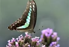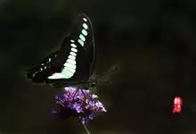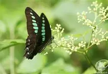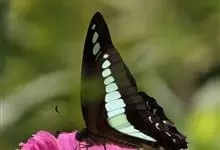 青带凤蝶Graphium sarpedon ,又名青凤蝶,是最普遍的中型凤蝶,飞行速度很快。青带凤蝶的翅膀中央有许多浅蓝色的斑点,很整齐地排列成一条直线。这些斑点由上而下逐渐变大,就像一条青色的带子。全部>>