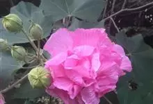 木芙蓉,锦葵科木槿属落叶灌木或小乔木。小枝上有细绒毛;叶片为卵状心形,托叶为披针形,常早落;花单生,花萼为钟形,花冠初为白色或淡红色,后逐渐变为深红色;果实为扁球形,有淡黄色的毛附着。花期8到10月。…全部>>