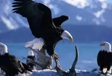 白头海雕又名美洲雕。是大型猛禽,成年海雕体长可达1米,翼展2米多长。眼、嘴和脚为淡黄色,头、颈和尾部的羽毛为白色,身体其他部位的羽毛为暗褐色,十分雄壮美丽。主要栖息在海岸、湖沼和河流附近,以大马哈鱼…全部>>