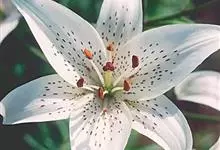 东北百合,别名卷莲花、老哇芋头、轮叶百合、伞蛋花、山丹花,为百合科、百合属多年生球根花卉。鳞茎卵圆形,白色,有节。苞片叶状,花淡橙红色,具紫红色斑点;花被片稍反卷,蒴果倒卵形,花期7-8月,果期9月,…全部>>