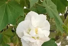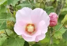 海滨木槿是锦葵科木槿属植物,落叶小乔木,株高3-5米,胸径20厘米,扁球形树冠,枝叶繁盛。厚纸质单叶互生,扁圆形、倒卵形或宽倒卵形,先端钝近平,具短突尖,基部圆形或浅心形,叶缘中上部具细圆齿,…全部>>