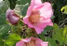 木芙蓉,锦葵科木槿属落叶灌木或小乔木。小枝上有细绒毛;叶片为卵状心形,托叶为披针形,常早落;花单生,花萼为钟形,花冠初为白色或淡红色,后逐渐变为深红色;果实为扁球形,有淡黄色的毛附着。花期8到10月。…全部>>