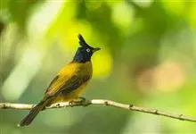 黑冠黄鹎:体长18-21厘米,是一种中等体型偏黄色鹎。整个头、颈、颏、喉黑色,头顶有显著直立的羽冠,黑色,上体褐橄榄黄绿色,下体橄榄黄色。虹膜偏红;嘴及脚黑色。…全部>>