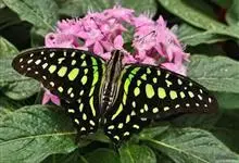 青带凤蝶Graphium sarpedon ,又名青凤蝶,是最普遍的中型凤蝶,飞行速度很快。青带凤蝶的翅膀中央有许多浅蓝色的斑点,很整齐地排列成一条直线。这些斑点由上而下逐渐变大,就像一条青色的带子。全部>>