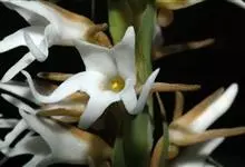 风兰 H.H.Hu):植株高8-10厘米。茎长1-4厘米,稍扁,被叶鞘所包。叶厚革质,狭长圆状镰刀形。总状花序长约1厘米,具2-5朵花;花白色,芳香;花瓣倒披针形或近匙形,长8-10毫米,…全部>>