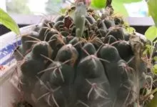 绯花玉 Speg.)是仙人掌科、裸萼球属多肉植物,植株呈扁球形,表皮墨绿色,刺针状,每个刺座有5枚灰色周刺,花生于球体顶端,夏季开花,花色有白、粉红、深红等。果实纺锤形,深灰绿色,种子黑色。…全部>>