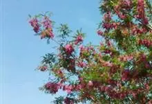 红花刺槐是豆科刺槐属的植物。其干皮深纵裂;枝具托叶刺,羽状复叶互生,叶片卵形或长圆形,具芒尖;基部圆形。花两性;总花序下垂;花冠粉红色,芳香;果条状长圆形,腹缝有窄翅。花期4~5月,果期9~10月。…全部>>