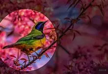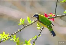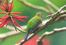 橙腹叶鹎体形大小和金额叶鹎相似,体长16~20厘米。额至后颈黄绿色,其余上体绿色,小覆羽亮钴蓝色,形成明显的肩斑。颏、喉、上胸黑色具钴蓝色髭纹,其余下体橙色。飞羽和尾羽雄鸟黑色、雌鸟绿色。…全部>>